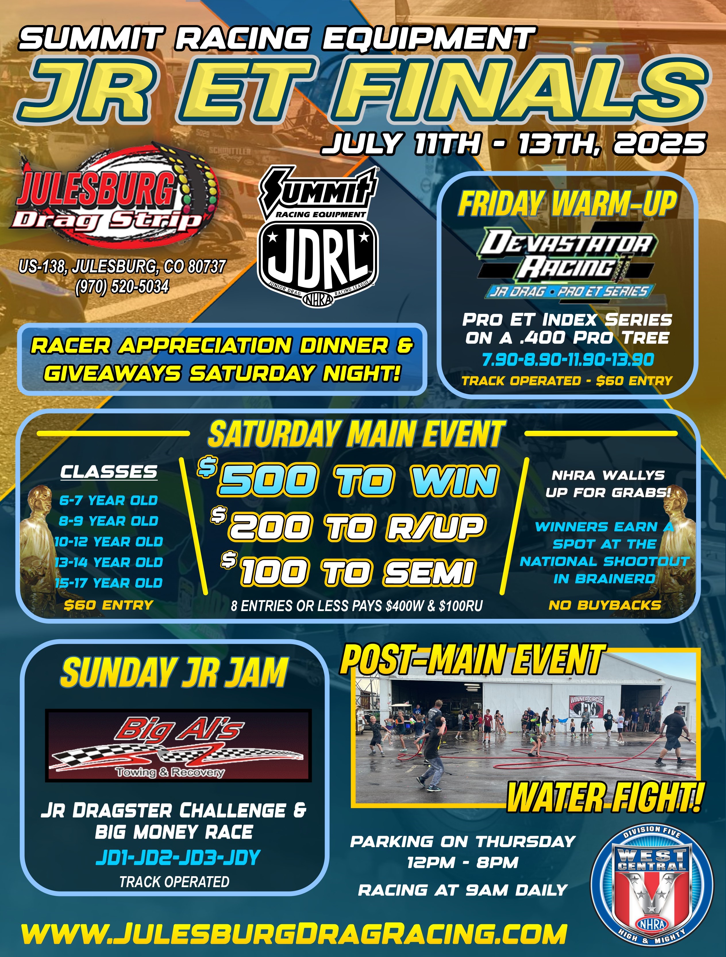 | Billions Southtown Jr. Dragster (Summit JR ET Finals Class) | .5 Full Tree Handicapped Start. For Kids 7 to 17 - 1/8 Mile Race. Must be NHRA Licensed. Billion Southtown sponsored $100 Winner & $50 Runner Up Gift Cards |